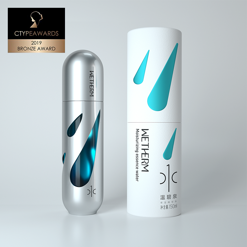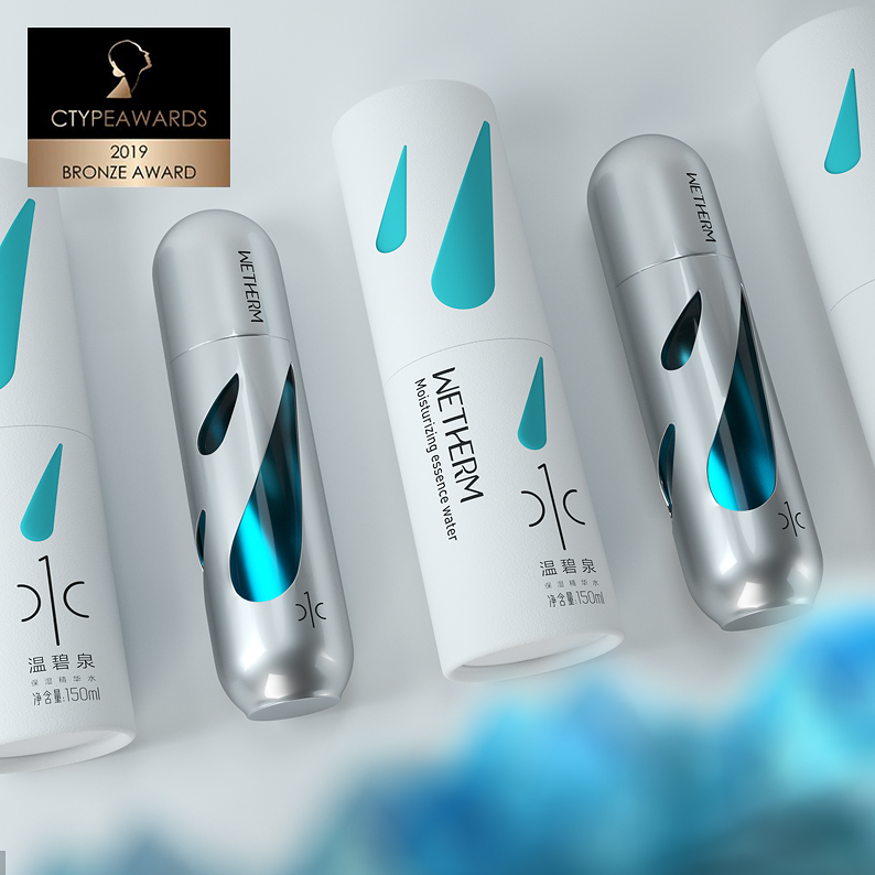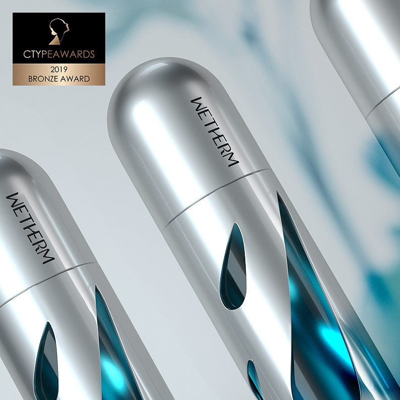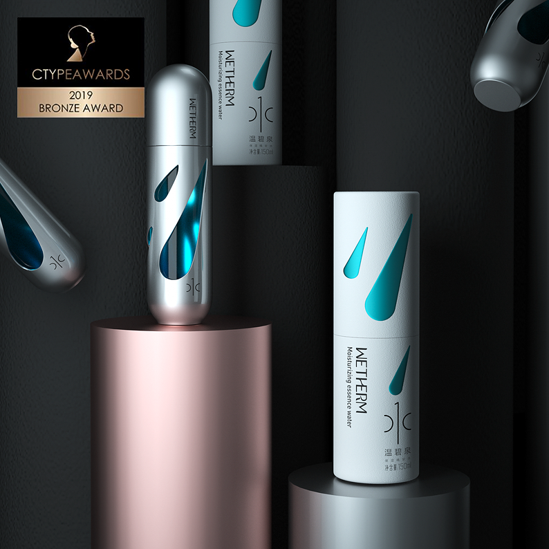 CTYPEAWARDS is a international event focusing on cosmetics. Accompanied by top creative review from around the world, Mr. Mok., the founder of MATCH, served as Chairman of the international judge group, and invited 10 most authoritative international masters in the field of cosmetics creation to form a jury of heavyweights and pass strict assessment standards and choose the most creative works. We will create the specialized, authoritative and authentic award. It is honored the Oscar in the field of cosmetics creation.The design of WETHERM No.1 Moisturizing Water vessel is inspired by science fiction films and scenes. The shape of the aircraft is a very simple shuttle, which conveys the concept of rapid replenishment of water and has a strong sense of technology. The shape of three water drops in the metal shell reflects the properties of water replenishing products. Through the water drops, you can see the blue inner bottle. The vision is mysterious and the sense of technology arises spontaneously because of the unique design form.