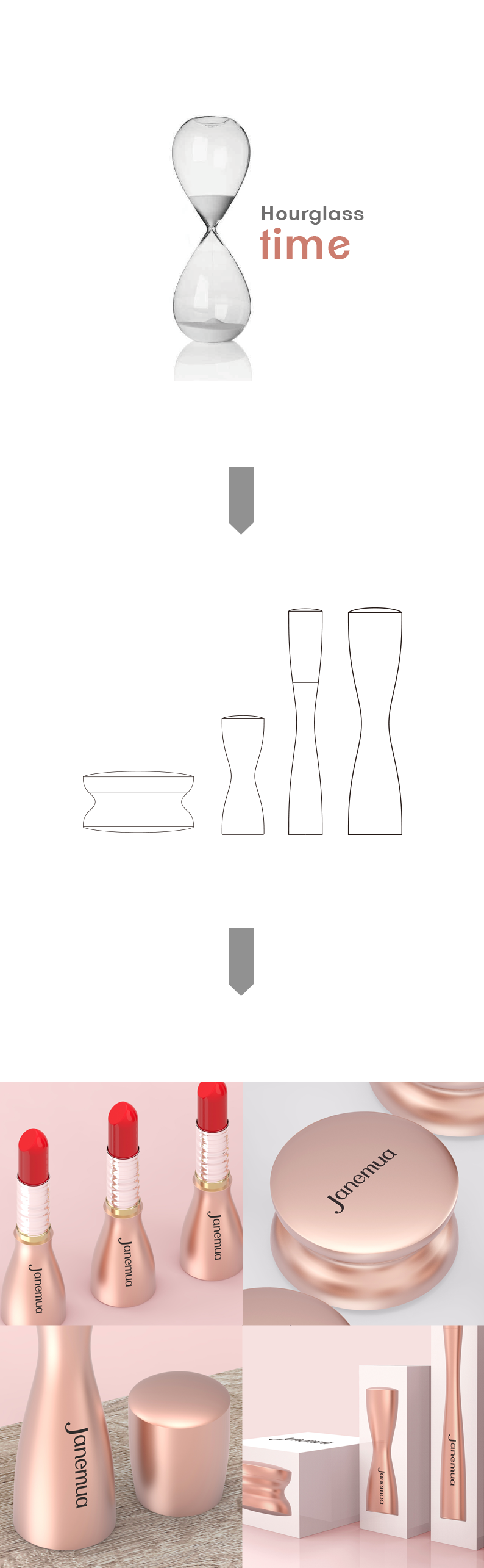珍慕彩妝系列設(shè)計(jì),創(chuàng)意靈感來源于沙漏。沙漏是記錄時(shí)間的工具,以此代表時(shí)間概念,提醒人們珍惜時(shí)間,享受美好時(shí)光。流線造型符合女性群體和化妝品定位,如窈窕淑女,似順滑肌膚。外觀造型簡(jiǎn)約凝練,氣質(zhì)個(gè)性時(shí)尚。珍慕彩妝留住美好瞬間!