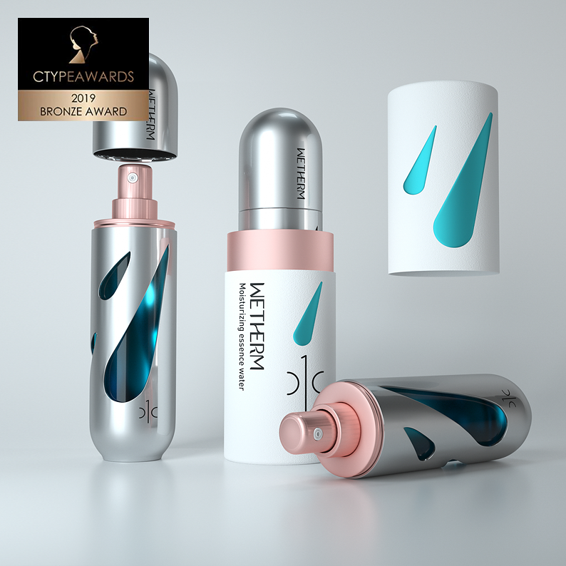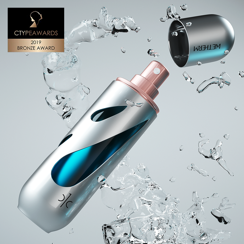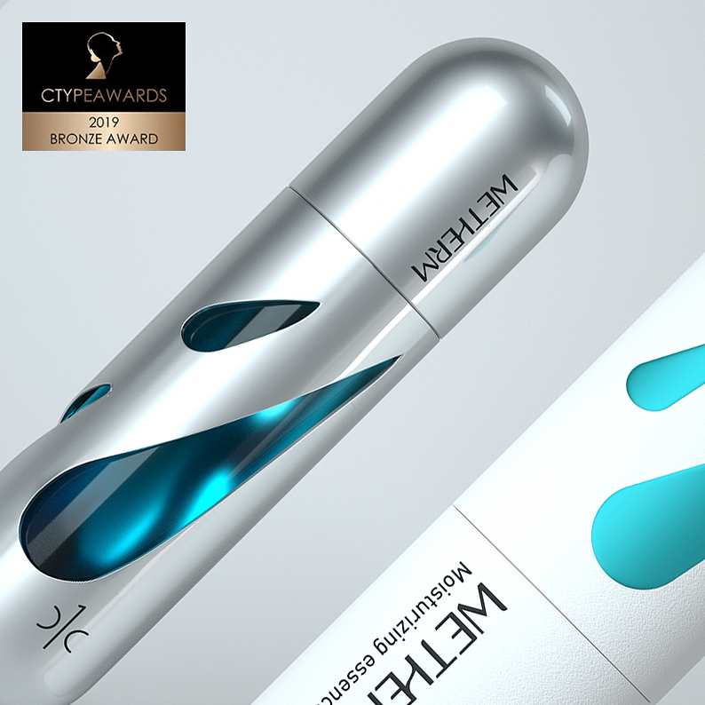 CTYPEAWARDS is a international event focusing on cosmetics. Accompanied by top creative review from around the world, Mr. Mok., the founder of MATCH, served as Chairman of the international judge group, and invited 10 most authoritative international masters in the field of cosmetics creation to form a jury of heavyweights and pass strict assessment standards and choose the most creative works. We will create the specialized, authoritative and authentic award. It is honored the Oscar in the field of cosmetics creation.The design of WETHERM No.1 Moisturizing Water vessel is inspired by science fiction films and scenes. The shape of the aircraft is a very simple shuttle, which conveys the concept of rapid replenishment of water and has a strong sense of technology. The shape of three water drops in the metal shell reflects the properties of water replenishing products. Through the water drops, you can see the blue inner bottle. The vision is mysterious and the sense of technology arises spontaneously because of the unique design form.