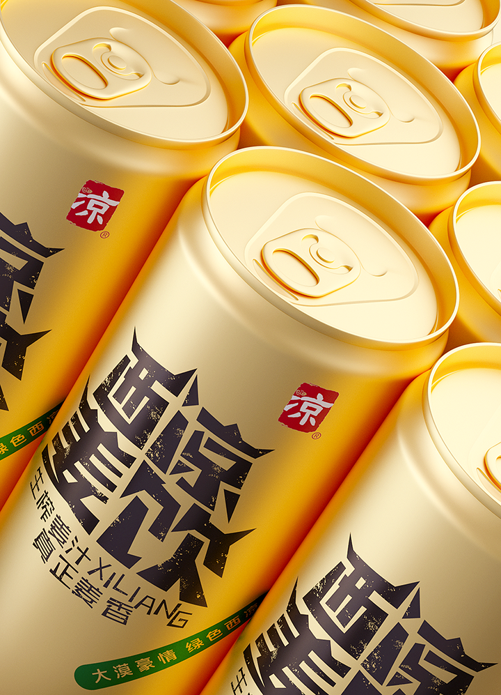 Xiliang ginger drink adopts the traditional technology of raw ginger juice to ensure the quality and taste of the product. The creativity combines Jiayuguan, desert, oasis, ginger juice and other elements, the font design of the brand name is Jiayuguan shape, the golden tank body and oasis ingeniously combine to form the sense of golden ginger juice flowing down. Color and shape are oases in the desert, expressing the meaning of precious water source. The golden pot is like an endless desert, and the golden ginger juice forms a positive and negative shape with the lower oasis, which skillfully shows the feeling of golden ginger juice overflowing from the mouth of the jar. The new design gives a new image to Xiliang ginger drink, which has the personality of Northwest China and contains the characteristic positioning of the product.