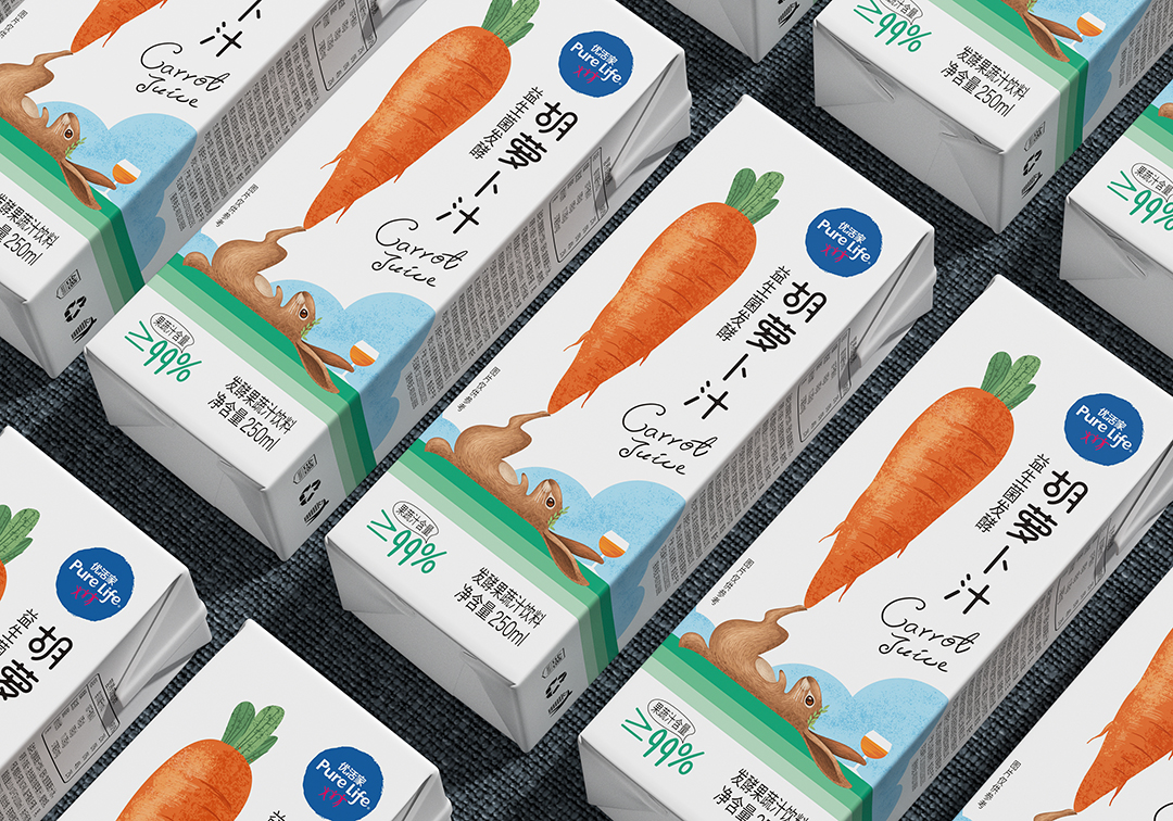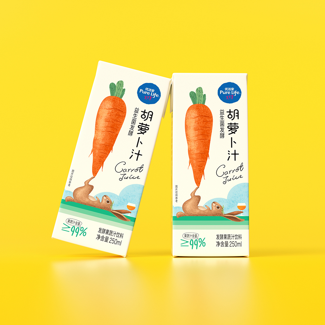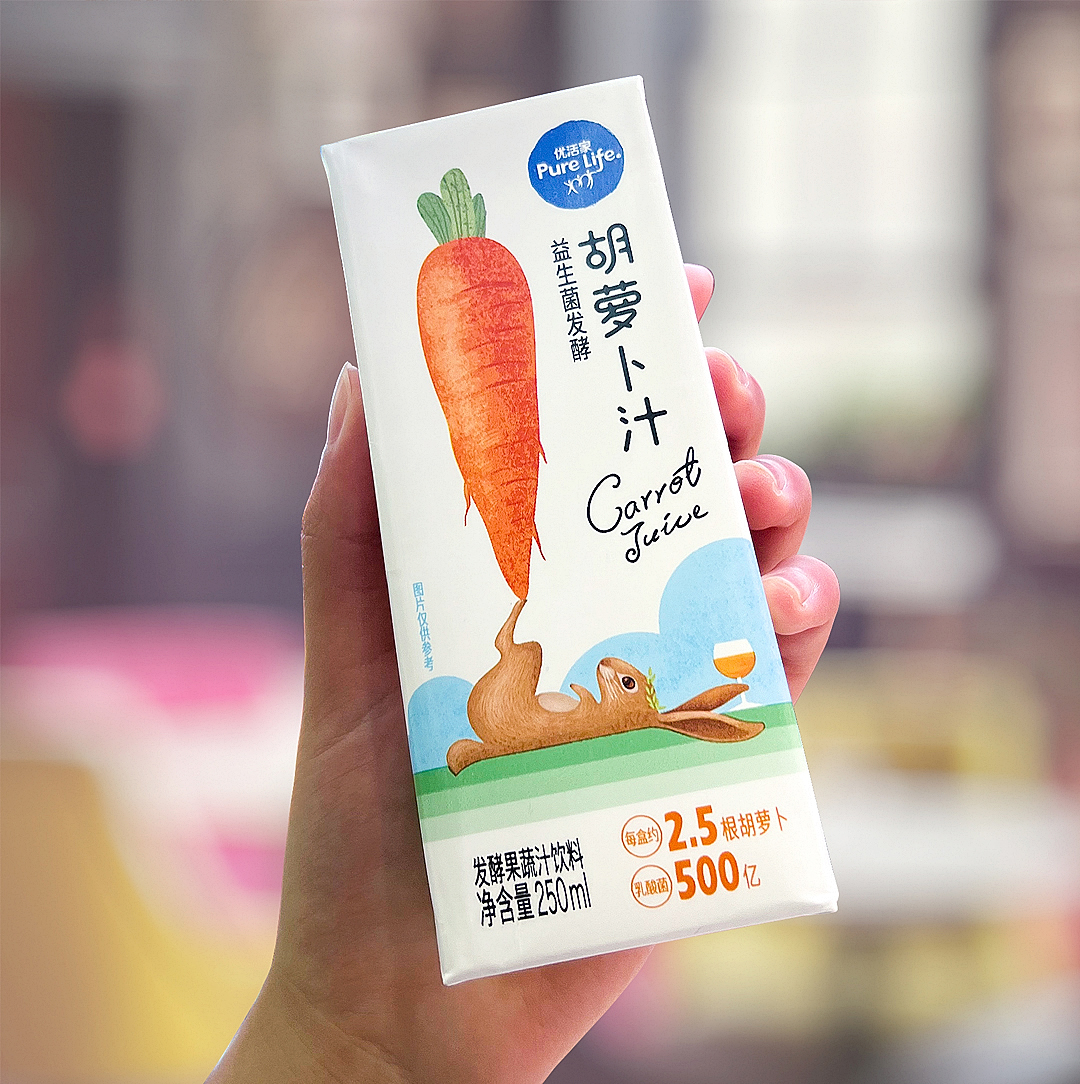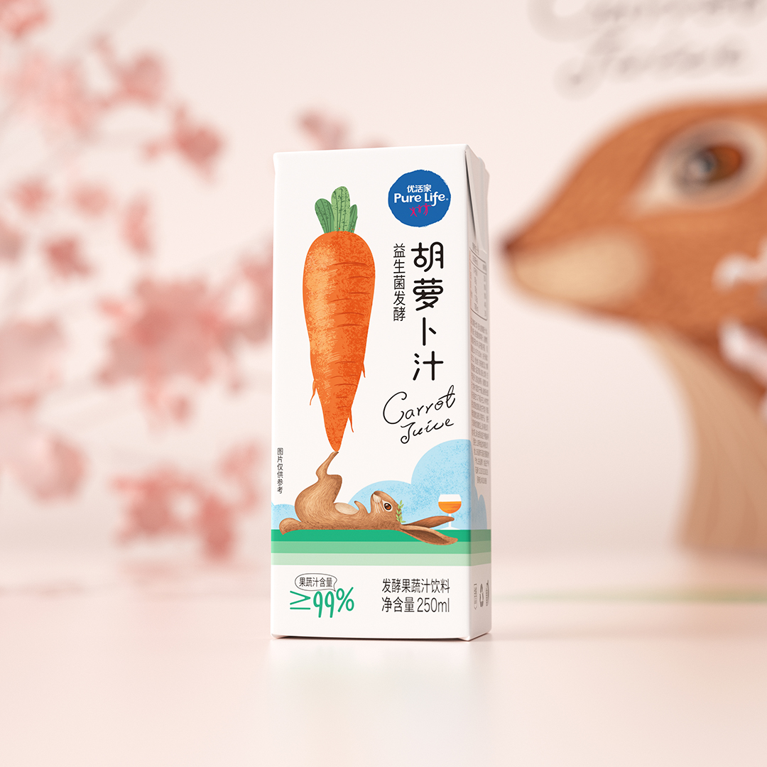 優(yōu)活家胡蘿卜汁每盒相當(dāng)于2.5根胡蘿卜的營養(yǎng),包裝設(shè)計主圖案采用手繪形式表現(xiàn),軟萌可愛的外表,趣味十足,讓人有想要品嘗的感受。