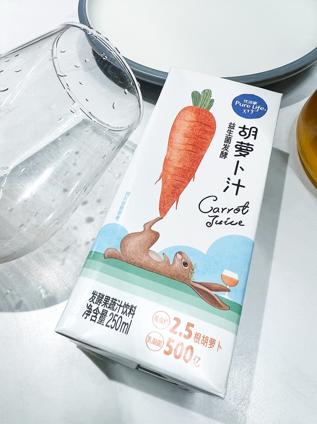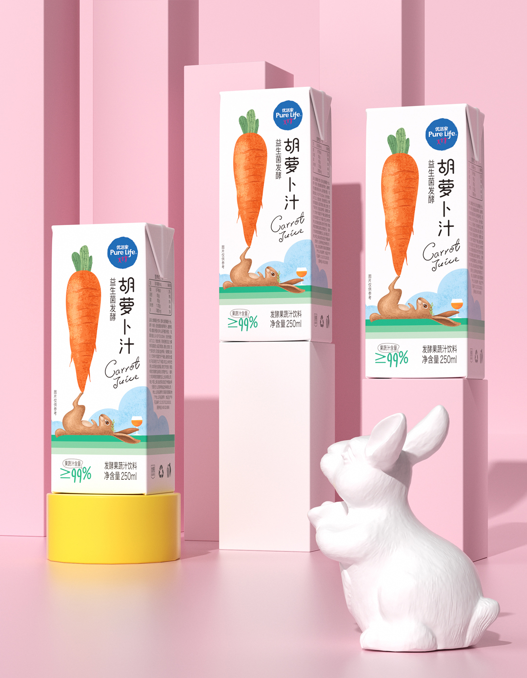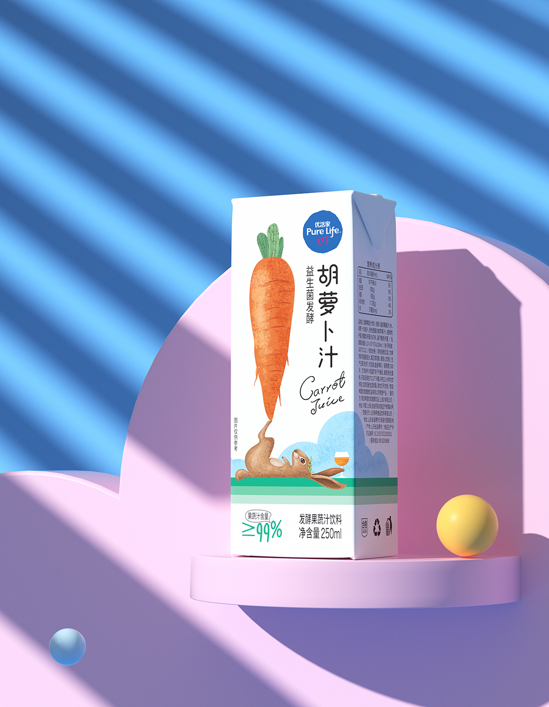 優(yōu)活家胡蘿卜汁每盒相當(dāng)于2.5根胡蘿卜的營養(yǎng),包裝設(shè)計主圖案采用手繪形式表現(xiàn),軟萌可愛的外表,趣味十足,讓人有想要品嘗的感受。