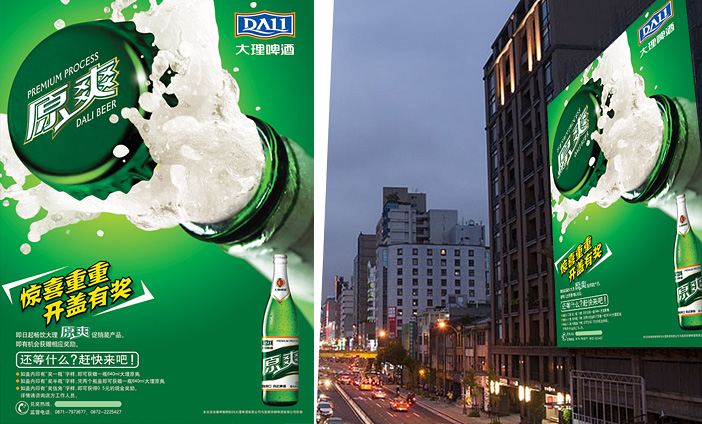 博創(chuàng)為大理啤酒創(chuàng)意設計了系列產(chǎn)品上市海報、促銷海報和活動海報等,畫面表現(xiàn)形式上突顯產(chǎn)品清爽特性,整體大氣,高端,具品質(zhì)感和視覺沖擊力,符合產(chǎn)品定位和品牌理念。
